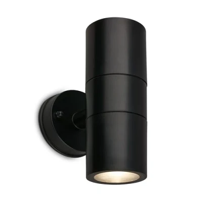 Lights.coCylindrical outdoor wall lamp with two GU10 sockets, upward and downward light distribution This outdoor wall light in a simple cylindrical shape made of plastic with glass covers is equipped with one GU10 socket at the top and one at the bottom, which can be fitted with PAR16 bulbs (exclusive). With upward and downward light emission, the wall light is a stylish choice for many facades and entrance areas. IP code: IP54