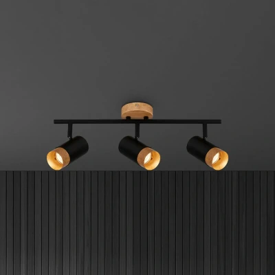 Lights.coThree-lamp ceiling spot Plek made of metal in black and light woodModern and natural at the same time, the ceiling spot Plek presents itself with the combination of black lacquered metal on the housing of the three cylindrical heads as well as their holder and light wood on the canopy as well as attachments on the light outlets. The spotlight heads can also be rotated and swivelled so that the Plek surface-mounted spotlight can be perfectly adapted to the respective conditions.