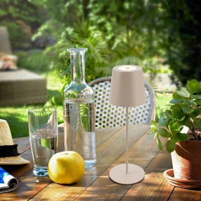 Elegant design: In a soft beige colour, this battery operated table lamp blends seamlessly into any interior Efficient lighting: Equipped with a 2.5W LED module that delivers 200 lumens at a warm colour temperature of 2,700K Adjustable brightness: The wireless table lamp features a 3-step touch dimmer (100%, 50%, 15%) for flexible light settings Long operating time and portability: With an integrated 1200mAh battery the weatherproof outdoor table lamp provides up to 12 hours of lighting time; IP44 certification protects against splashing water Easy to maintain and practical: the battery and circuit board are easy to replace, which increases the portable table lamp's longevity; easy charging with the 0.5 m USB cable supplied
