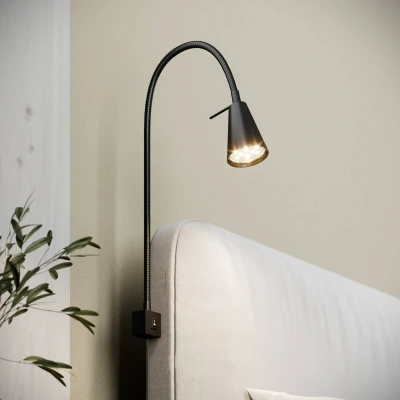 Tuso LED wall light with flexible arm and plate for mounting on the bed Whether on the left, right or top of the bed, the Tuso LED wall light can be mounted anywhere thanks to the mounting plate that can be adjusted 90° to the side. The long flexible arm offers maximum flexibility in the alignment of the light, so that the light position can be optimally adjusted for evening reading. The switch has been integrated into the angular base of the light, making it easy to reach from the bed. The Tuso LED wall light comes with a replaceable GU10 LED bulb and a transparent cable that is 180 cm long.