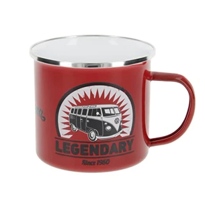LEGENDARY: This iconic coffee mug is in red and features a black T1 VW Bus, white details, and the inscription "Legendary since 1950". The mug is 8.5 cm (3.3 inches) high and holds 500ml (16.9 fl oz). EASY TO CARE FOR: The mugs are easy to clean and durable. They should be washed by hand with a soft sponge, water, and dish soap, and should not be placed in the dishwasher. MULTIFUNCTIONAL USE: The iconic mugs can be used not only for hot beverages such as tea and coffee but also for cocktails. They are also suitable for enjoying soups or having cereal while camping. TECHNICAL DETAILS: The Beetle mugs are made of lightweight and durable steel and coated with enamel. The thin stainless steel rim provides a pleasant drinking experience. Not suitable for microwaves. OFFICIALLY LICENSED: The stylish coffee mug in VW T1 Bus design is an officially licensed Volkswagen product. All our items are developed in Germany to meet our high quality standards.