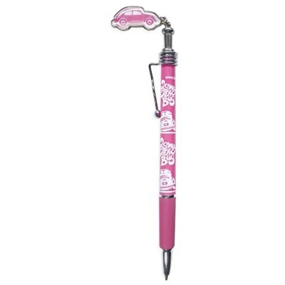LOVE THAT BUG/PINK: The VW ballpoint pen is pink and adorned with the VW Beetle and the "LOVE THAT BUG" inscription. An adorable extra is the silver clip pendant featuring the side view of a VW Beetle. PRACTICAL Details: Our VW BEETLE pens are equipped with a fine metal clip at the top end of the pen, allowing it to be attached and used anywhere. MULTIFUNCTIONAL: These cool ballpoint pens are a wonderful companion for daily use at home, university, or the office. MATERIAL Details: The stylish pens are made of 15 cm (5.9 inches) plastic and metal. They are filled with black ink and have a rubberized grip zone for secure writing without slipping out of the hand. OFFICIALLY LICENSED: These adorable ballpoint pens are an officially licensed Volkswagen product. All our items are developed in Germany to meet our high-quality standards.