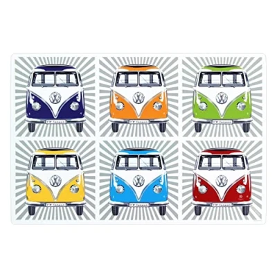 SAMBA STRIPES/MULTICOLOR: The 4-piece set features gray stripes on the printed surface, showcasing the classic VW T1 Bus in colorful front views within six brightly colored squares. Dimensions: 45 x 30 cm (17.7 x 11.8 inches). Made in Italy. PRACTICAL Details: Our placemats in VW T1 Bus design protect the table from scratches, spilled liquids, and food residue, and they're easy to wipe clean. MULTIFUNCTIONAL: The iconic placemats serve as practical accessories for daily use, providing a surface for cups, glasses, plates, and even functioning as a mouse pad. TECHNICAL Details: The set includes 4 placemats made of high-quality polypropylene. They are lightweight, durable, heat-resistant up to 80°C, and waterproof. OFFICIALLY LICENSED: The iconic placemats are officially licensed Volkswagen products. All our items are developed in Germany to meet our high-quality standards.