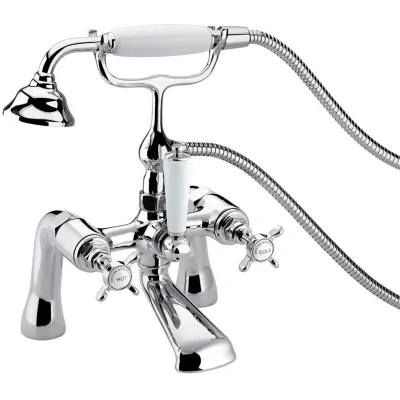 General description This Bristan 1901 Pillar Bath Shower Mixer Tap features advanced ceramic disc technology for long-lasting performance and ease of use. With a robust brass construction and a stunning chrome finish, this tap is designed to enhance your bathroom's traditional style while ensuring durability and reliability. Technical specifications Tap Height: 345 mm Tap Spout Reach: 18 cm Inlet Connection Size: 3/4 BSP Min Pressure: 0.2 Bar Max Pressure: 5.0 Bar Flow Rate - 0.2 Bar: 23.2 l/min Flow Rate - 0.5 Bar: 38.7 l/min Flow Rate - 1.0 Bar: 54.7 l/min Flow Rate - 2.0 Bar: 77.4 l/min Flow Rate - 3.0 Bar: 82 l/min Flow Rate - 5.0 Bar: 122.4 l/min Material: Brass Colour: Chrome Style: Traditional Tap Body Shape: Round Compatibility and accessories Includes 1.5m hose, cradle, and single function handset Waste sold separately Installation Mounting Type: Pillar Tap Handles: 3 Tap Holes: 2 Usage Rub clean handset for easy removal of limescale and debris Standard tap operation with