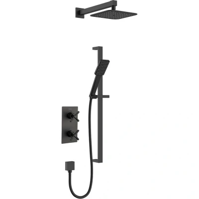 All in one box - pack includes shower valve with integral two outlet diverter, slimline 200mm square drench head with shower arm, and shower kit with an adjustable riser rail plus a single function handset and wall outlet Adjustable fixing brackets on riser rail enables existing screw holes to be usedRub clean handset and drench head - limescale and debris build-up is quickly and easily removed by rubbing a finger or a cloth over the nozzles Easy installation with an adjustable faceplate that fits total wall depths from 60mm to 75mm for a perfect flush finish Integral two outlet diverter so you can easily switch between the handset or drench head Thermostatic cartridge with preset temperature safety stop at 42°C for family-safe showering A higher temperature can be selected, if required, by selecting the override function Thermostatic cartridge with preset temperature safety stop at 42°C for family-safe showering A higher temperature can be selected, if required, by selecting the
