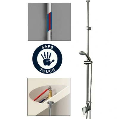General description This Bristan Jute Contemporary Mini Twinline Thermostatic Ceiling Fed Shower features a sleek chrome-plated design and is equipped with Cool Touch Technology, ensuring safety and comfort during use. The shower is designed for easy installation, allowing you to replace your existing shower without disturbing your tiles. Technical specifications Type: Ceiling fed Control: Single control for flow and temperature Thermostatic cartridge: Maintains temperature to +/- 1°C Maximum temperature: Factory set to 43°C (adjustable) Material: Chrome plated to BSN 248 Installation Can be fitted directly to solid walls or pre-tiled walls Surface mounted valve with hot and cold feeds through the ceiling Usage Automatic shut off in case of hot or cold water supply failure Anti-scald safety feature encases hot water to ensure safe temperature Includes integral riser rail, 1.5m shower hose, hose retainer, and single function handset with rub clean nozzles Other information Guarantee: 5