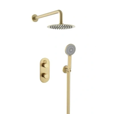 All in one box - pack includes shower valve with integral two outlet diverter, slimline 200mm round drench head with shower arm, plus a multi function handset and wall outlet Multi function rub clean handset and drench head - limescale and debris build-up is quickly and easily removed by rubbing a finger or a cloth over the nozzles On-trend brushed brass finish to make a statement in your bathroom Easy installation with an adjustable faceplate that fits total wall depths from 60mm to 75mm for a perfect flush finish Dual control - Flow and temperature are operated separately giving accurate control of both Cartridge can be accessed from the front for easy servicing Cartridge can be accessed from the front for easy servicing 15mm inlet connections 5-year parts and 1 year labour guarantee for peace of mind Also available in other finishes.