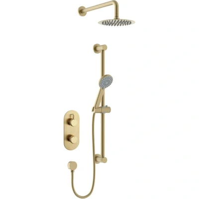 All in one box - pack includes shower valve with integral two outlet diverter, slimline 200mm round drench head with shower arm, and shower kit with an adjustable riser rail plus a multi function handset and wall outlet Multi function rub clean handset and drench head - limescale and debris build-up is quickly and easily removed by rubbing a finger or a cloth over the nozzles On-trend brushed brass finish to make a statement in your bathroom Easy installation with an adjustable faceplate that fits total wall depths from 60mm to 75mm for a perfect flush finishDual control - Flow and temperature are operated separately giving accurate control of both Cartridge can be accessed from the front for easy servicing Cartridge can be accessed from the front for easy servicing 15mm inlet connections 5-year parts and 1 year labour guarantee for peace of mind Also available in other finishes.