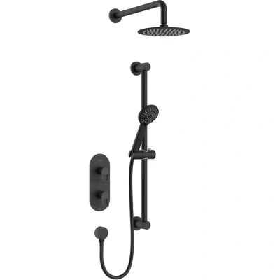 All in one box - pack includes shower valve with integral two outlet diverter, slimline 200mm round drench head with shower arm, a multi function handset and wall outlet Multi function rub clean handset and drench head - limescale and debris build-up is quickly and easily removed by rubbing a finger or a cloth over the nozzles On-trend matt black finish to make a statement in your bathroom Easy installation with an adjustable faceplate that fits total wall depths from 60mm to 75mm for a perfect flush finish Dual control - Flow and temperature are operated separately giving accurate control of both Cartridge can be accessed from the front for easy servicing Cartridge can be accessed from the front for easy servicing 15mm inlet connections 5-year parts and 1 year labour guarantee for peace of mind Also available in other finishes.