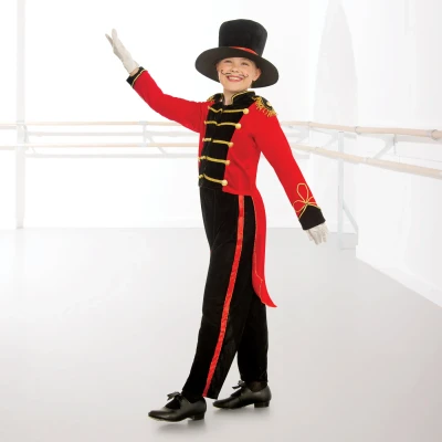 This child Ringmaster is perfect for your circus! * Unisex ringmaster costume including hat, jacket and pants * Red and black velour Jacket with gold fringe detail, gold attached buttons and rows of gold brocade * Velcro fastening up the centre front of jacket * Black velour pants with elasticated waist * Red ribbon trim down both trouser legs * Top hat included with matching ribbon trim * Material: 100% PolyesterProduct Warnings:Warning: Not suitable for children under 36 monthsWarning: Small parts. Choking hazard. Adult supervision recommendedWarning: Keep away from fireWarning: Dancewear/Costume designed for training, exam or stage use only