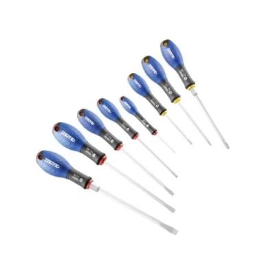 General description These Britool screwdrivers are designed for comfort and effectiveness, featuring a bi-material ergonomic handle that ensures a secure grip during use. The set includes a variety of screwdrivers suitable for different tasks. Technical specifications Material: Chrome vanadium steel Blade finish: Round chrome plated Tip finish: Sand blasted Set includes: 2 x Parallel Slotted Screwdrivers: 3x50mm and 4x100mm 3 x Flared Slotted Screwdrivers: 5.5x125mm, 6.5x150mm, and 8x175mm 3 x Phillips Screwdrivers: PH0x75mm, PH1x100mm, and PH2x125mm