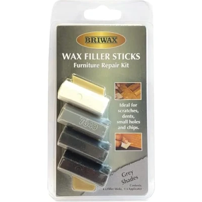 General description Briwax Wax Filler Sticks are designed for the repair of scratches, cracks, and small holes on wooden and plastic surfaces. Ideal for small damaged areas of furniture and other wooden items, these sticks provide a quick and easy solution for surface repairs without the need for heat. Each pack contains four sticks in different shades within the specified color, including grey and various wood shades. Technical specifications Color: Grey (also available in light, medium, and dark wood shades) Pack quantity: 4 sticks Dimensions: approximately 18mm (height) x 92mm (width) x 179mm (length) Weight: 0.05 kg Compatibility and accessories Compatible with all types of wooden surfaces and plastics Includes an applicator for easy use Installation Remove any raised or rough edges from the damaged area before application. Break a small piece of the wax stick and press it into the damaged area using the applicator. Remove excess wax with the applicator for a smooth finish. Allow