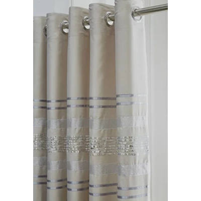 Sequin design in biscuit beige and silver Each curtain in the pair is 66 inches (168 cm) by a 90 inch drop (229 cm) making a combined width of 132 inches (336 cm) 100% polyester Machine washable, can be tumble dried Also available in white and black