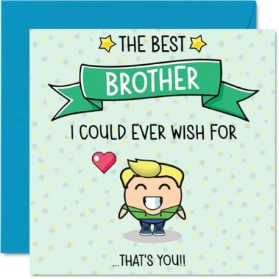 MAKE YOUR BROTHER SMILE WITH THIS UNIQUE BIRTHDAY CARD: This exceptional quality Brother birthday card for him shows the design 'The Best Brother I Could Ever Wish For? That?s You!!'. If you are looking for an awesome birthday card Brother for him, then then this happy birthday Brother card is bound to make him smile. Not just a birthday card for Brother this could also be a birthday gifts for Brother, Step Brother or Silbing. WHAT DO YOU GET: The card is printed on one side and BLANK ON THE INSIDE to allow you to write your very own message. The unique fun design is printed on a specially sourced and environmentally responsible board. At 360 microns thick the natural white one-sided gloss board has a quality look and feel. Supplied with a coloured gummed envelope to complement the design and ready to be sealed and sent in the post. Great Brother birthday cards, Step Brother birthday card. NO INK SMUDGES: There is nothing worse than writing inside a card to find that the shiny surface makes the ink smudge. This is why we use a high quality one sided coated board. The uncoated side will absorb more of the ink from your pen to make smudging a thing of the past. Brother birthday cards, Brother birthday cards from Sister. SIZES: Greeting Card = 145mm x 145mm, Envelope = 155mm x 155mm, Card Thickness = 360 micron. Happy birthday Brother, Brothers birthday card, Brother cards birthday, birthday card Brother, happy birthday Brother card, Brother gifts from Sister. MADE AND QUALITY CHECKED IN THE UK: We print and manufacture all our products right here in the UK so you can be sure of a fast turnaround and a product that is expertly made. Using environmentally responsible premium board our card is conscious of the responsible management of the world's forests - happy birthday card Brother, Brother birthday cards.