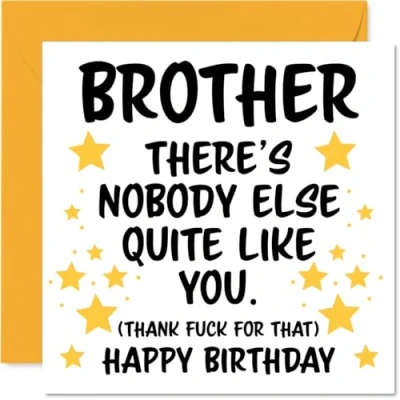 MAKE YOUR BROTHER SMILE WITH THIS UNIQUE BIRTHDAY CARD: This exceptional quality Brother birthday card shows the design 'Brother Theres nobody else quite like you. (Thank fuck for that) Happy Birthday'. If you are looking for an awesome birthday card for Brother, then then this happy birthday Brother card is bound to make them smile. Not just a birthday card for Brother this could also be a birthday gifts for Brother, Step Brother or Silbing. WHAT DO YOU GET: The card is printed on one side and BLANK ON THE INSIDE to allow you to write your very own message. The unique fun design is printed on a specially sourced and environmentally responsible board. At 360 microns thick the natural white one-sided gloss board has a quality look and feel. Supplied with a coloured gummed envelope to complement the design and ready to be sealed and sent in the post. Great Brother birthday cards, Step Brother birthday card. NO INK SMUDGES: There is nothing worse than writing inside a card to find that the shiny surface makes the ink smudge. This is why we use a high quality one sided coated board. The uncoated side will absorb more of the ink from your pen to make smudging a thing of the past. Brother birthday cards, Brother birthday cards from Sister. SIZES: Greeting Card = 145mm x 145mm, Envelope = 155mm x 155mm, Card Thickness = 360 micron. Happy birthday Brother, Brothers birthday card, Brother cards birthday, birthday card Brother, happy birthday Brother card, Brother gifts from Sister. MADE AND QUALITY CHECKED IN THE UK: We print and manufacture all our products right here in the UK so you can be sure of a fast turnaround and a product that is expertly made. Using environmentally responsible premium board our card is conscious of the responsible management of the world's forests - happy birthday card Brother, Brother birthday cards.