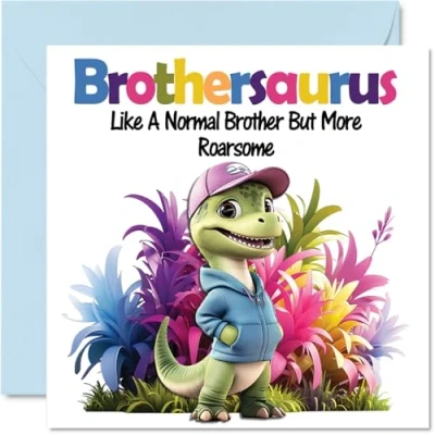 MAKE YOUR BROTHER SMILE WITH THIS BEAUTIFUL BIRTHDAY CARD: This exceptional quality brother birthday card for him shows the design "Brothersaurus Like A Normal Brother But More Roarsome". If you are looking for a beautiful birthday card brother for him, then then this happy birthday brother card is bound to make him smile. Not just a birthday card for brother this could also be a birthday gifts for Brother, Bro or Step Brother. WHAT DO YOU GET: The cards are printed on both sides with the inside print showcasing a cute verse and ample space for your own personal message. The unique fun design is printed on a specially sourced and environmentally responsible board. At 360 microns thick the natural white one-sided gloss board has a quality look and feel. Supplied with a coloured gummed envelope to complement the design and ready to be sealed and sent in the post. NO INK SMUDGES: There is nothing worse than writing inside a card to find that the shiny surface makes the ink smudge. This is why we use a high quality one sided coated board. The uncoated side will absorb more of the ink from your pen to make smudging a thing of the past. Brother birthday cards, brother birthday cards from sister. SIZES: Greeting Card = 145mm x 145mm, Envelope = 155mm x 155mm, Card Thickness = 360 micron. Happy birthday brother, brothers birthday card, brother cards birthday, birthday card brother, happy birthday brother card, brother gifts from sister, happy first birthday as my big brother. MADE AND QUALITY CHECKED IN THE UK: We print and manufacture all our product right her in the UK so you can be sure of a fast turnaround and a product that is expertly made. Using environmentally responsible premium board our card is conscious of the responsible management of the world's forests - happy birthday card brother, brother birthday cards.