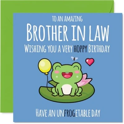 MAKE YOUR BROTHER IN LAW SMILE WITH THIS UNIQUE BIRTHDAY CARD: This exceptional quality Brother in Law birthday card shows the design 'To an amazing Brother in Law Wishing you a very hoppy birthday. Have an unfrogetable day'. If you are looking for a beautiful birthday card Brother in Law, then then this happy birthday Brother in Law card is bound to make them smile. Not just a birthday card for Brother in Law this could also be a birthday gifts for Brother in Law, Brother or Silbing. WHAT DO YOU GET: The card is printed on one side and BLANK ON THE INSIDE to allow you to write your very own message. The unique fun design is printed on a specially sourced and environmentally responsible board. At 360 microns thick the natural white one-sided gloss board has a quality look and feel. Supplied with a coloured gummed envelope to complement the design and ready to be sealed and sent in the post. Brother in Law Bday cards, Brother birthday cards, Silbing birthday card. NO INK SMUDGES: There is nothing worse than writing inside a card to find that the shiny surface makes the ink smudge. This is why we use a high quality one sided coated board. The uncoated side will absorb more of the ink from your pen to make smudging a thing of the past. Brother in Law birthday cards, Brother in Law birthday cards from Sister. SIZES: Greeting Card = 145mm x 145mm, Envelope = 155mm x 155mm, Card Thickness = 360 micron. Happy birthday Brother in Law, Brother in Laws birthday card, Brother in Law cards birthday, birthday card Brother in Law, happy birthday Brother in Law card, Brother in Law gifts from Sister. MADE AND QUALITY CHECKED IN THE UK: We print and manufacture all our products right here in the UK so you can be sure of a fast turnaround and a product that is expertly made. Using environmentally responsible premium board our card is conscious of the responsible management of the world's forests - happy birthday card Brother in Law, Brother in Law birthday cards.