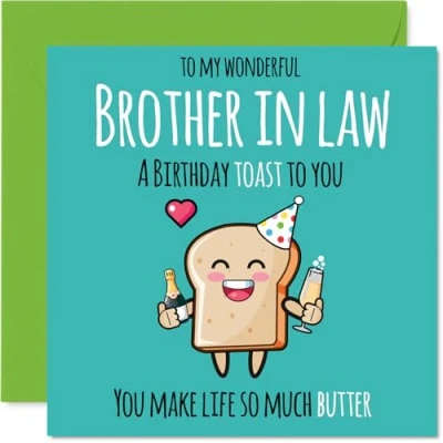 MAKE YOUR BROTHER IN LAW SMILE WITH THIS UNIQUE BIRTHDAY CARD: This exceptional quality Brother in Law birthday card shows the design 'To my wonderful Brother in Law a birthday toast to you. You make life so much better'. If you are looking for a beautiful birthday card Brother in Law, then then this happy birthday Brother in Law card is bound to make them smile. Not just a birthday card for Brother in Law this could also be a birthday gifts for Brother in Law, Brother or Silbing. WHAT DO YOU GET: The card is printed on one side and BLANK ON THE INSIDE to allow you to write your very own message. The unique fun design is printed on a specially sourced and environmentally responsible board. At 360 microns thick the natural white one-sided gloss board has a quality look and feel. Supplied with a coloured gummed envelope to complement the design and ready to be sealed and sent in the post. Brother in Law Bday cards, Brother birthday cards, Silbing birthday card. NO INK SMUDGES: There is nothing worse than writing inside a card to find that the shiny surface makes the ink smudge. This is why we use a high quality one sided coated board. The uncoated side will absorb more of the ink from your pen to make smudging a thing of the past. Brother in Law birthday cards, Brother in Law birthday cards from Sister. SIZES: Greeting Card = 145mm x 145mm, Envelope = 155mm x 155mm, Card Thickness = 360 micron. Happy birthday Brother in Law, Brother in Laws birthday card, Brother in Law cards birthday, birthday card Brother in Law, happy birthday Brother in Law card, Brother in Law gifts from Sister. MADE AND QUALITY CHECKED IN THE UK: We print and manufacture all our products right here in the UK so you can be sure of a fast turnaround and a product that is expertly made. Using environmentally responsible premium board our card is conscious of the responsible management of the world's forests - happy birthday card Brother in Law, Brother in Law birthday cards.
