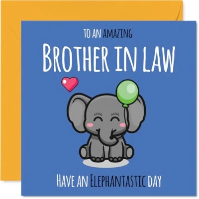 MAKE YOUR BROTHER IN LAW SMILE WITH THIS UNIQUE BIRTHDAY CARD: This exceptional quality Brother in Law birthday card shows the design 'To An Amazing Brother in Law Have An Elephantastic Day'. If you are looking for an awesome birthday card for Brother in Law, then then this happy birthday Brother in Law card is bound to make them smile. Not just a birthday card for Brother in Law this could also be a birthday gifts for Brother in Law, Brother or Silbing. WHAT DO YOU GET: The card is printed on one side and BLANK ON THE INSIDE to allow you to write your very own message. The unique fun design is printed on a specially sourced and environmentally responsible board. At 360 microns thick the natural white one-sided gloss board has a quality look and feel. Supplied with a coloured gummed envelope to complement the design and ready to be sealed and sent in the post. Great Brother in Law birthday cards, Brother birthday card. NO INK SMUDGES: There is nothing worse than writing inside a card to find that the shiny surface makes the ink smudge. This is why we use a high quality one sided coated board. The uncoated side will absorb more of the ink from your pen to make smudging a thing of the past. Brother in Law birthday cards, Brother in Law birthday cards from Sister. SIZES: Greeting Card = 145mm x 145mm, Envelope = 155mm x 155mm, Card Thickness = 360 micron. Happy birthday Brother in Law, Brother in Laws birthday card, Brother in Law cards birthday, birthday card Brother in Law, happy birthday Brother in Law card, Brother in Law gifts from Sister. MADE AND QUALITY CHECKED IN THE UK: We print and manufacture all our products right here in the UK so you can be sure of a fast turnaround and a product that is expertly made. Using environmentally responsible premium board our card is conscious of the responsible management of the world's forests - happy birthday card Brother in Law, Brother in Law birthday cards.