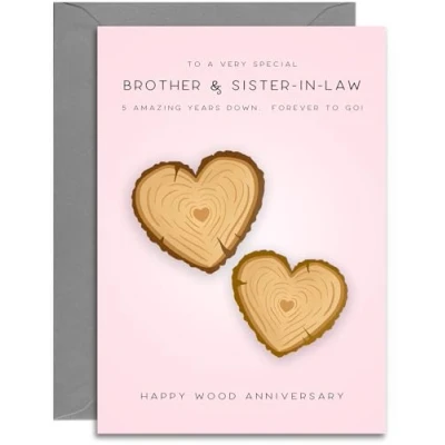 BROTHER & SISTER-IN-LAW 5 YEAR ANNIVERSARY CARD ⭐ Wood Hearts Design ⭐ Click the second image for the text inside the card. EXTRA THICK CARDSTOCK ⭐ 330gsm triple coated cardstock with a lovely matt inside surface for ease of writing SIZE ⭐This anniversary card measure 148 x 210mm (A5 Size) and comes with a 162 x 229mm Grey envelope UK MANUFACTURED ⭐ A small family business. Professionally printed in our Hampshire factory ECO FRIENDLY ⭐ Our factory runs on 100% renewable energy. Our cardstock is sustainably sourced. Both the card and envelope are fully recyclable.