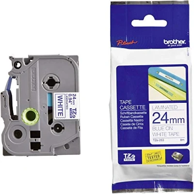 Laminated - blue text on a white background, 24 mm in width and 8 m long Uses - Brother's distinct patented technology offers durability inside the office, home and outdoors; Ideal for assets tags, warning and H&S labels, file and folders, shelves and kitchen uses Features - only Brother genuine tapes are rigorously tested to be temperature, sunlight, water, fade and abrasion resistant Variety - Over 60 colour and size variations on offer, there’s a solution for every task Brother TZe-253 Labelling Tape Cassette, 24 mm (W) x 8M (L), Laminated, Brother Genuine Supplies - Blue on White Colour: Blue on White Item weight: 0.01 Pounds
