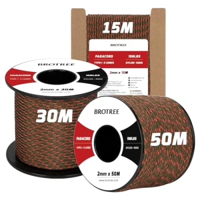 ✅【100% Nylon】The paracord 2mm has a 3 strands inner core and a 16 strands compact outer sheath design, each inner strand is braided with 3 twisted nylon fibers. Made of 100% nylon, this tactical cord can support up to 90kg (200lbs) of weight. ✅【Exceptional Performance】This nylon rope is resistant to UV, mildew, corrosion, fading, abrasion and common chemicals, so it can maintain stable performance in extreme temperature conditions. Unlike other cheap paracord, nylon rope does not emit an unpleasant odour. ✅【Diverse Options】The 15m paracord comes in a cardboard, 30/50m paracord comes on a spool that are designed for ease of portability, storage and to avoid tangling. The cord is available in different colors and can be paired with different styles for various outdoor and handmade activities. ✅【Easy Cutting & Usage】The length can be easily adjusted as needed and it is recommended that a high temperature blade is used or the tape is wrapped before cutting. Seal the edge by burning this parachute cord with a lighter and pressing it for a smooth, flat finish to prevent a loose end. ✅【Versatile Applications】Flexible and easy to knot, the utility rope is widely used for camping, fishing, survival, crafting, hiking. It also serves well for making paracord projects like bracelets, dog collar, wrapping hatchets, knives and more. NOT FOR CLIMBING USE!