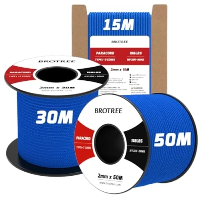 ✅【100% Nylon】The paracord 2mm has a 3 strands inner core and a 16 strands compact outer sheath design, each inner strand is braided with 3 twisted nylon fibers. Made of 100% nylon, this tactical cord can support up to 90kg (198lbs) of weight. ✅【Exceptional Performance】This nylon rope is resistant to UV, mildew, corrosion, fading, abrasion and common chemicals, so it can maintain stable performance in extreme temperature conditions. Unlike other cheap paracord, nylon rope does not emit an unpleasant odour. ✅【Diverse Options】The 30/50m paracord comes on a spool that is designed for ease of portability, storage and to avoid tangling. The cord is available in different colors and can be paired with different styles for various outdoor and handmade activities. ✅【Easy Cutting & Usage】The length can be easily adjusted as needed and it is recommended that a high temperature blade is used or the tape is wrapped before cutting. Seal the edge by burning this parachute cord with a lighter and pressing it for a smooth, flat finish to prevent a loose end. ✅【Versatile Applications】Flexible and easy to knot, the utility rope is widely used for camping, fishing, survival, crafting, hiking. It also serves well for making paracord projects like bracelets, dog collar, wrapping hatchets, knives and more. NOT FOR CLIMBING USE!