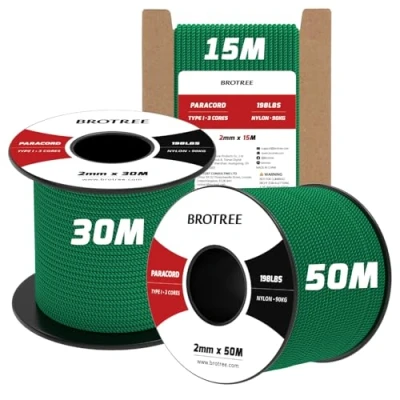 ✅【100% Nylon】The paracord 2mm has a 3 strands inner core and a 16 strands compact outer sheath design, each inner strand is braided with 3 twisted nylon fibers. Made of 100% nylon, this tactical cord can support up to 90kg (200lbs) of weight. ✅【Exceptional Performance】This nylon rope is resistant to UV, mildew, corrosion, fading, abrasion and common chemicals, so it can maintain stable performance in extreme temperature conditions. Unlike other cheap paracord, nylon rope does not emit an unpleasant odour. ✅【Diverse Options】The 15m paracord comes in a cardboard, 30/50m paracord comes on a spool that are designed for ease of portability, storage and to avoid tangling. The cord is available in different colors and can be paired with different styles for various outdoor and handmade activities. ✅【Easy Cutting & Usage】The length can be easily adjusted as needed and it is recommended that a high temperature blade is used or the tape is wrapped before cutting. Seal the edge by burning this parachute cord with a lighter and pressing it for a smooth, flat finish to prevent a loose end. ✅【Versatile Applications】Flexible and easy to knot, the utility rope is widely used for camping, fishing, survival, crafting, hiking. It also serves well for making paracord projects like bracelets, dog collar, wrapping hatchets, knives and more. NOT FOR CLIMBING USE!