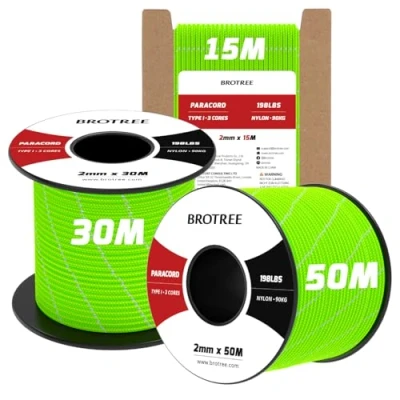 ✅【100% Nylon】The paracord 2mm has a 3 strands inner core and a 16 strands compact outer sheath design, each inner strand is braided with 3 twisted nylon fibers. Made of 100% nylon, this tactical cord can support up to 90kg (200lbs) of weight. ✅【Exceptional Performance】This nylon rope is resistant to UV, mildew, corrosion, fading, abrasion and common chemicals, so it can maintain stable performance in extreme temperature conditions. Unlike other cheap paracord, nylon rope does not emit an unpleasant odour. ✅【Diverse Options】The 15m paracord comes in a cardboard, 30/50m paracord comes on a spool that are designed for ease of portability, storage and to avoid tangling. The cord is available in different colors and can be paired with different styles for various outdoor and handmade activities. ✅【Easy Cutting & Usage】The length can be easily adjusted as needed and it is recommended that a high temperature blade is used or the tape is wrapped before cutting. Seal the edge by burning this parachute cord with a lighter and pressing it for a smooth, flat finish to prevent a loose end. ✅【Versatile Applications】Flexible and easy to knot, the utility rope is widely used for camping, fishing, survival, crafting, hiking. It also serves well for making paracord projects like bracelets, dog collar, wrapping hatchets, knives and more. NOT FOR CLIMBING USE!