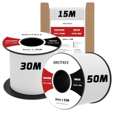 ✅【100% Nylon】The paracord 2mm has a 3 strands inner core and a 16 strands compact outer sheath design, each inner strand is braided with 3 twisted nylon fibers. Made of 100% nylon, this tactical cord can support up to 90kg (198lbs) of weight. ✅【Exceptional Performance】This nylon rope is resistant to UV, mildew, corrosion, fading, abrasion and common chemicals, so it can maintain stable performance in extreme temperature conditions. Unlike other cheap paracord, nylon rope does not emit an unpleasant odour. ✅【Diverse Options】The 30/50m paracord comes on a spool that is designed for ease of portability, storage and to avoid tangling. The cord is available in different colors and can be paired with different styles for various outdoor and handmade activities. ✅【Easy Cutting & Usage】The length can be easily adjusted as needed and it is recommended that a high temperature blade is used or the tape is wrapped before cutting. Seal the edge by burning this parachute cord with a lighter and pressing it for a smooth, flat finish to prevent a loose end. ✅【Versatile Applications】Flexible and easy to knot, the utility rope is widely used for camping, fishing, survival, crafting, hiking. It also serves well for making paracord projects like bracelets, dog collar, wrapping hatchets, knives and more. NOT FOR CLIMBING USE!