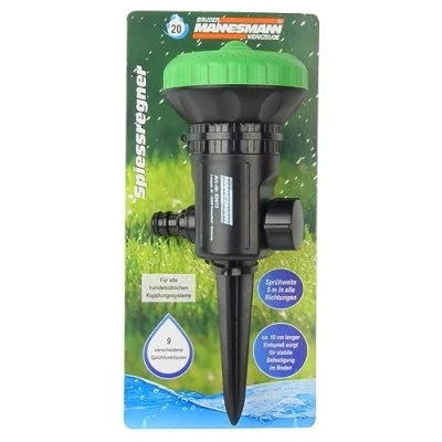 Approx. 10 cm long ground spike ensures stable attachment in the ground Spray range 5 m in all directions 9 different spray functions For all standard coupling systems, Manufacturer: Brüder Mannesmann Werkzeuge GmbH