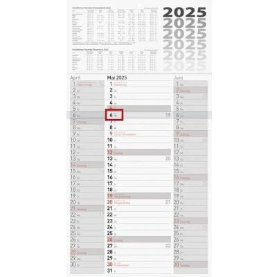 W/H: 300 × 560 mm, sheet size: 300 × 425 mm 1 sheet = 3 months, print colour: black/red, 70 g/m² Holiday dates Germany and Austria With red date slider Rear in grey