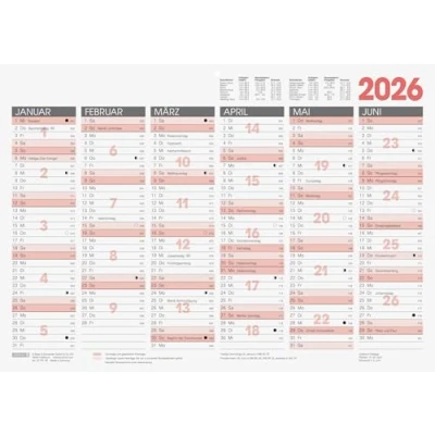 W x H: 420 x 297 mm, format: A3 landscape 1 page = 6 months, print colour: black/red, 400 g/m² High-quality, strong cardboard, holiday dates in Germany For calendar year 2026