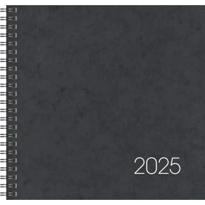 Sheet size: 210 x 205 mm 2 pages = 1 week, 144 pages, print colour calendar: black, 70 g/m², wire-o binding Cardboard envelope, colour: black, year overview previous year, current year and following year, 4 pages monthly plan current year, 4 pages following year, holiday dates Germany, 12 pages worth knowing, 12 pages of addresses With printed monthly tabs For calendar year 2025