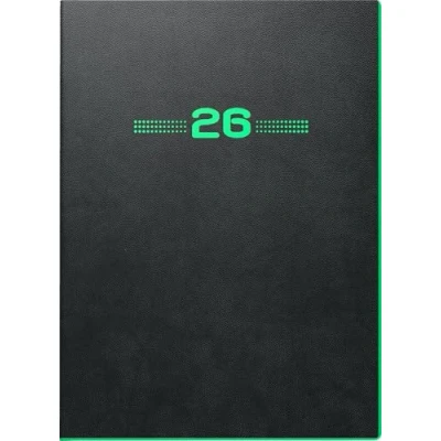 Sheet size: 148 x 208 mm 2 pages = 1 week, 128 pages, print colour calendar: black, 70 g/m², adhesive binding, four languages: German, English, French, Italian PU cover, colour: black, 4 pages monthly plan current year, 4 pages following year, holiday dates Germany, Austria, France and Luxembourg, 12 pages worth knowing Half-hourly division from 7-20 o'clock, not Sat. and so on. With neon edge green