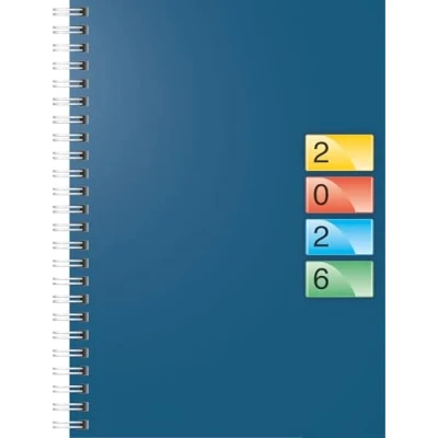Sheet size: 148 x 208 mm 2 pages = 1 week, 128 pages, print colour calendar: colourful, 70 g/m², wire-o binding, four languages: German, English, French, Italian Cardboard envelope, colour: blue, 3 pages monthly plan current year, 3 pages following year, holiday dates Germany and Austria, 12 pages worth knowing Half-hourly division from 7 am to 8 pm Corner perforation