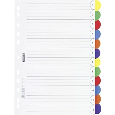 Item Name: Dividers for ring binder Material: Polypropylene (PP) Product Type: Colour Code Tabs: Half Round Design Hole: 11 holes