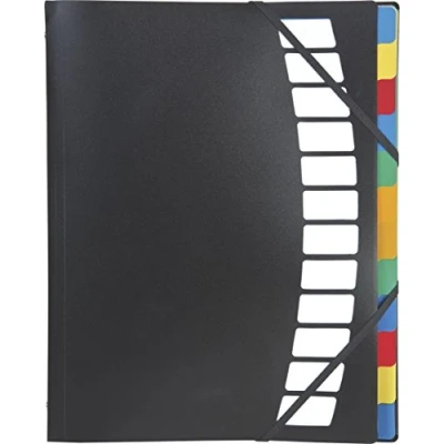 12-piece organiser folder Size A4, stable polypropylene With 3 flaps on the back cover Black 12-piece inner register with transparent protective cases on the front and back of each page
