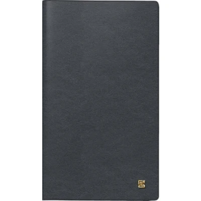 Sheet size: 87 x 153 mm 2 pages = 1 week, 144 pages, print colour calendar: black/blue, 70 g/m², adhesive binding, four languages: German, English, French, Italian Leather cover, colour: black, year overview current year and following year, 12 pages monthly plan current year and following year, holiday dates Germany, Austria and Switzerland, interchangeable address book, 16 pages With metal signet With search flap, transparent pocket and card pockets