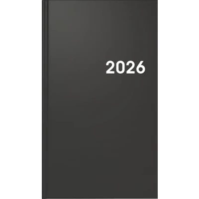Sheet size: 87 x 153 mm 2 pages = 1 week, 144 pages, print colour calendar: black/blue, 70 g/m², adhesive binding, four languages: German, English, French, Italian Plastic cover Balacron colour: black, year overview current year and following year, 12 pages monthly plan current year and following year, holiday dates Germany, Austria and Switzerland Corner perforation For calendar year 2026