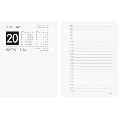 1070261005 (predecessor: 1070261004) 38 mm punched, shape 261 E Calendar: left side calendar, right page for notes Half-hourly division from 7 am to 8 pm (right side)