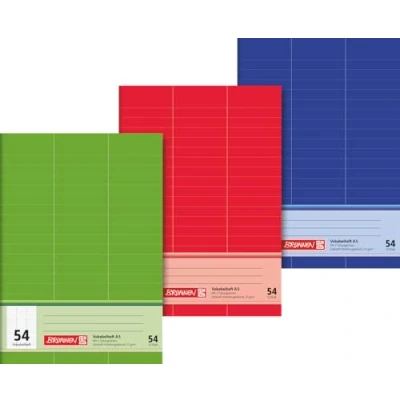 Brunnen vocabulary book DIN A5, 32 sheets, 1 item. 70 g/m² writing paper. 54, lined, with 2 dividing lines. No colour selection possible (colours green, red and blue). With labelling field on the front cover.