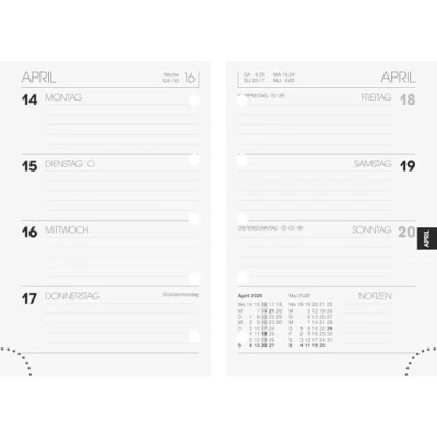 Insert for ring binder calendar Sheet size: 76 x 112 mm 2 pages = 1 week, 160 pages, print colour calendar: black, 70 g/m², 5 holes Annual overview of the previous year, current year, following year, 6 pages monthly plan following year, monthly plan current year, can be laid out, 3 parts, holiday dates Germany, 16 pages blank notes, 10 pages worth knowing, 16 pages of maps, additionally with 32 pages of addresses with register cut Corner perforation