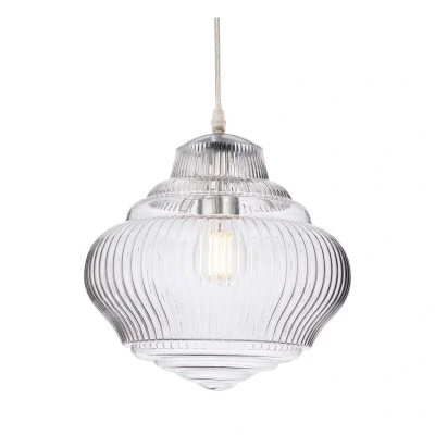 The Firstlight Brunswick Pendant offers a classic style with a modern twist. This fixture features an elegant, rounded bell shape, suspended from sleek chrome metalwork. The large, beautifully shaped curved decorative clear glass shade is the focal point, featuring subtle fluting that creates a stunning, prismatic light effect when illuminated.This pendant light is designed to be a prominent feature in dining rooms, living spaces, or kitchens. The clear glass ensures maximum, sparkling illumination, making it a great choice for brightening up any area. The adjustable cable allows for a generous maximum drop of 1560mm, providing versatility for rooms with high ceilings. With a substantial diameter of 270mm and a height of 250mm, it is perfectly sized for individual use or installation in a sequence of two or three.The fitting requires one E27 GLS bulb with a maximum wattage of 40W (sold separately). Due to the transparent nature of the shade, we strongly recommend using a decorative LED filament bulb to enhance the aesthetics and ensure superior energy efficiency. Shop now at SimplyLED to secure this premium contemporary lighting solution.Requires 1 x E27 GLS bulb max 40W (sold separately).