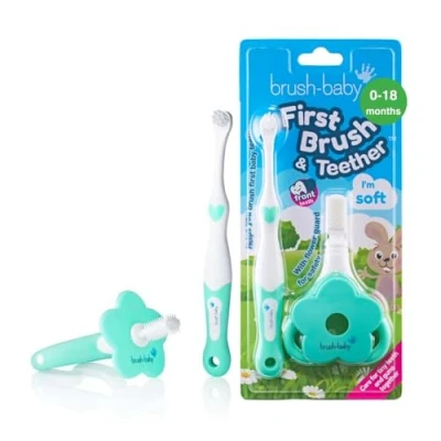 Safe Design - BPA-free baby toothbrush with soft bristles and flower guard teether massages sensitive gums while protecting your little one during early oral care exploration Easy Grip Handle - Long ergonomic handle fits comfortably for guided brushing, transitioning seamlessly as your baby develops independent brushing skills with this toddler toothbrush Complete Care Set - This baby first toothbrush set includes both FirstBrush toothbrush and FirstTeether, providing essential tools for your infant's oral development from 0-18 months Gentle Cleaning - Ultra-soft bristles on this baby toothbrush designed specifically for delicate gums and emerging teeth, making daily oral care comfortable for your little one Early Habits - Specially sized brush head fits tiny mouths while the teether soothes sore gums, encouraging positive oral care routines from the earliest stages