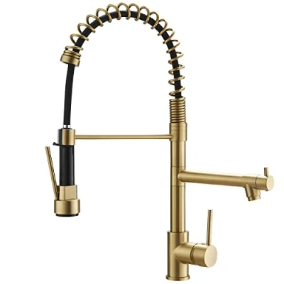Gold Kitchen Faucet with Pull Down Sprayer - Single Handle Commercial High Arc Single Handle Brushed Gold Pull Down Kitchen Sink Faucets Dual Spouts brass kitchen faucet of different uses satisfy your specific needs, The high-pressure nozzle provides a powerful, high-volume spray while the other one has a steady stream. you can utilize the Buckle Lock so you can lock on the spray mode and just focus on what you are washing. Meanwhile, the sprayer’s lock design allows you to free your hands when washing dishes. this brass faucet kitchen that features a pull-down function and 360-degrees spout rotation range. Like many of the other kitchen sinks faucet featured, this one also promises quick and unintimidating installation. The single lever gold kitchen sink faucet function can withstand rough usage through its commercial construction. Easily use the two nozzles to make sure you reach all corners of your sink. AIMADI gold kitchen faucet package includes all necessary hardware and gaskets for the kitchen faucets to save a lot of time under the sink. It's easy to install yourself, no plumber required, saving money and time. NOTE:Please note that the gold tone may appear slightly different under various lighting conditions.If you have any questions about AIMADI kitchen faucet gold, please send us a message via Amazon the first time, we will reply to any questions you have about kitchen sink faucets within 24 hours., Weight: 5.35943758922 Pounds, Manufacturer: AIMADI