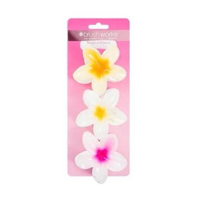 Brushworks Tropical Flower Claw Clips (3 Pack) Glossy Floral Hair Clamps, Secure Grip for Thick & Thin Hair, Hawaiian Plumeria Summer Accessories Women Girls, Vegan Cruelty Free