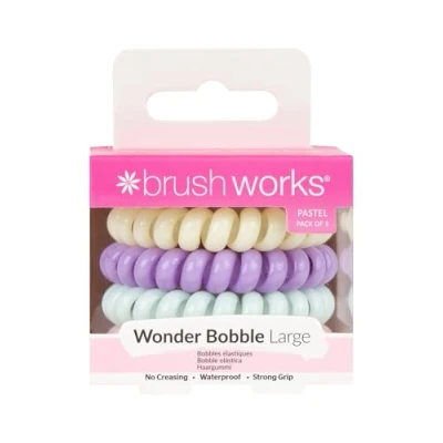 5 Brushworks wonder bobbles in Pastel Traceless Bobble which prevents hair from getting a band mark and helps to prevent hair damage caused by tugging and pulling Made out of high-quality pet which is non-toxic and eco-friendly Waterproof material makes the bobbles great for swimming and bathing without soaking Cruelty-free and vegan friendly