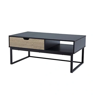 AmazonWOODEN COFFEE TABLE: Features a rectangular design complete with a contrasting black and natural wood design. Table top thickness 1.5cm. BUILT-IN STORAGE: A drawer and open shelf underneath allows for a selection of items to be hidden and displayed ensuring this large coffee table is an elegant addition to your home's lounge or living room. MULTIPURPOSE: Our Bryson table can be used as a coffee table, end table, side table or sideboard for organising your space in most rooms within your home such as living room, lounge, reception room, or front room. DURABILITY: Constructed from sturdy wood with metal legs for long lasting use, and its easy-to-clean surfaces make wiping up every day spills a breeze. Easy to assemble under 35 minutes with step by step instructions included. DIMENSIONS: The Bryson coffee table measures L105.4 x W60.3 x H45.1 cm. Weight Limit: 36.3kg.