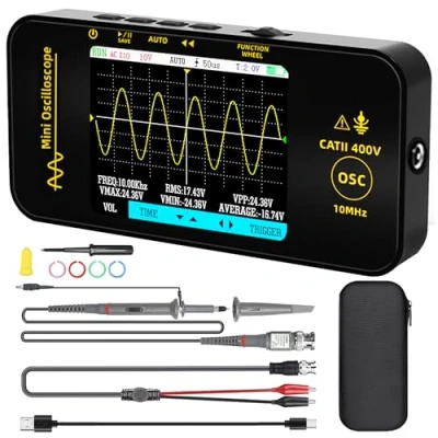 Handheld Oscilloscope: This OT3 digital oscilloscope has a 10MHz bandwidth, a high sampling rate of 48MSa/s, and can measure voltages up to 400V. Professional design: Portable oscilloscopes with complete triggering capabilities (single/normal/automatic) for both periodic analog and non-periodic digital signals. 3.2” TFT color screen: Mini oscilloscope's full-view display ensures that you can monitor signals more clearly, while intuitive buttons and menu navigation simplify operation. Thin and light body: Tablet Oscilloscopes is paired with a thin and light body, which is more compact and exquisite, and more convenient to use. Complimentary eva organizer bag, go out more portable. Longer Battery Life: Automotive oscilloscope has a built-in 1000 mAh high-quality lithium battery, no need to replace the battery frequently. Type-C interface supports data transmission and charging, firmware upgrade